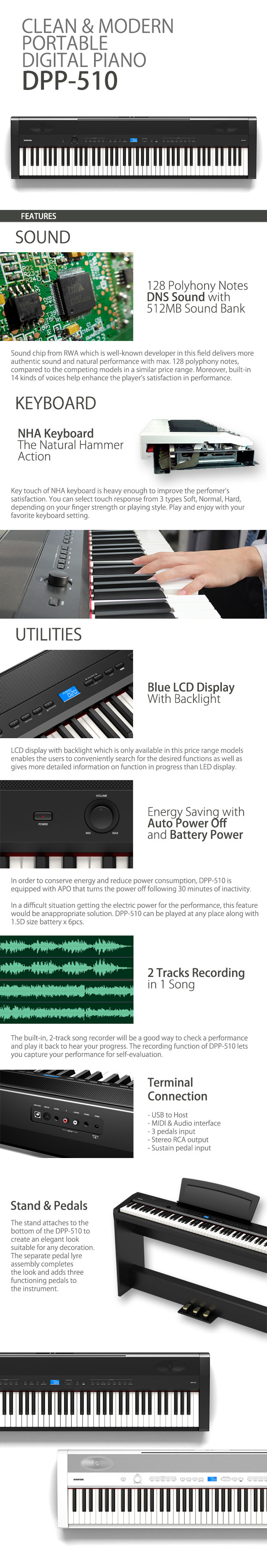 DPP-510, a portable piano with a clean and modern design, features natural sound like a real piano produced through stereo sampling of Dynamic Natural Sound (DNS). In addition, it has a keyboard with the same size and weight as those of the acoustic piano, and a variety of its built-in functions enhance utilization.