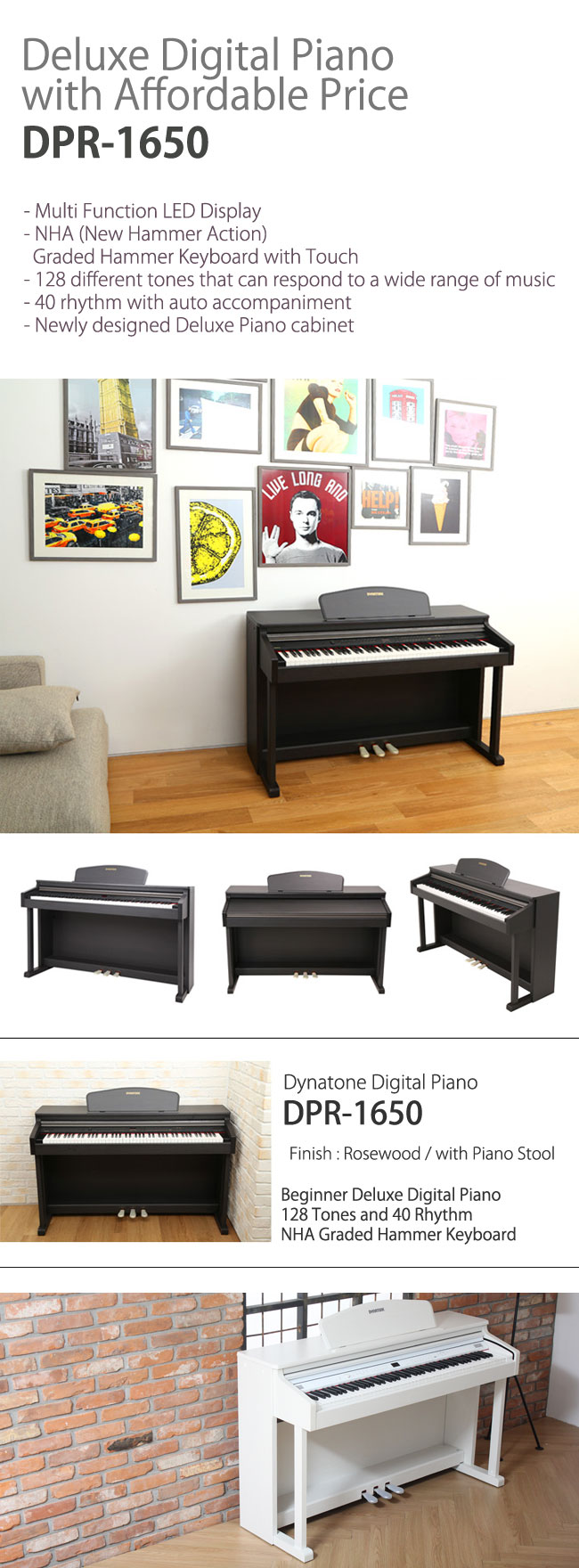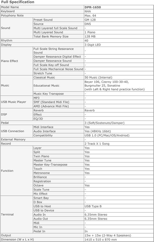 The DPR-1650 is the piano for those customers who wish to keep the cost reasonable while gaining access to the diverse utilities of a digital piano. The LED ensures easy manipulation of the unit. 40 types of auto-accompaniment in many genres are included which makes it so easy to play chords.