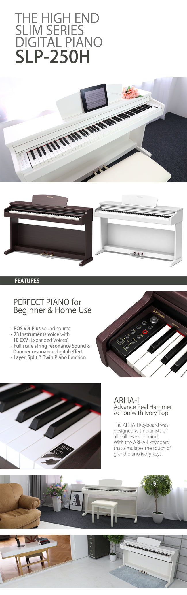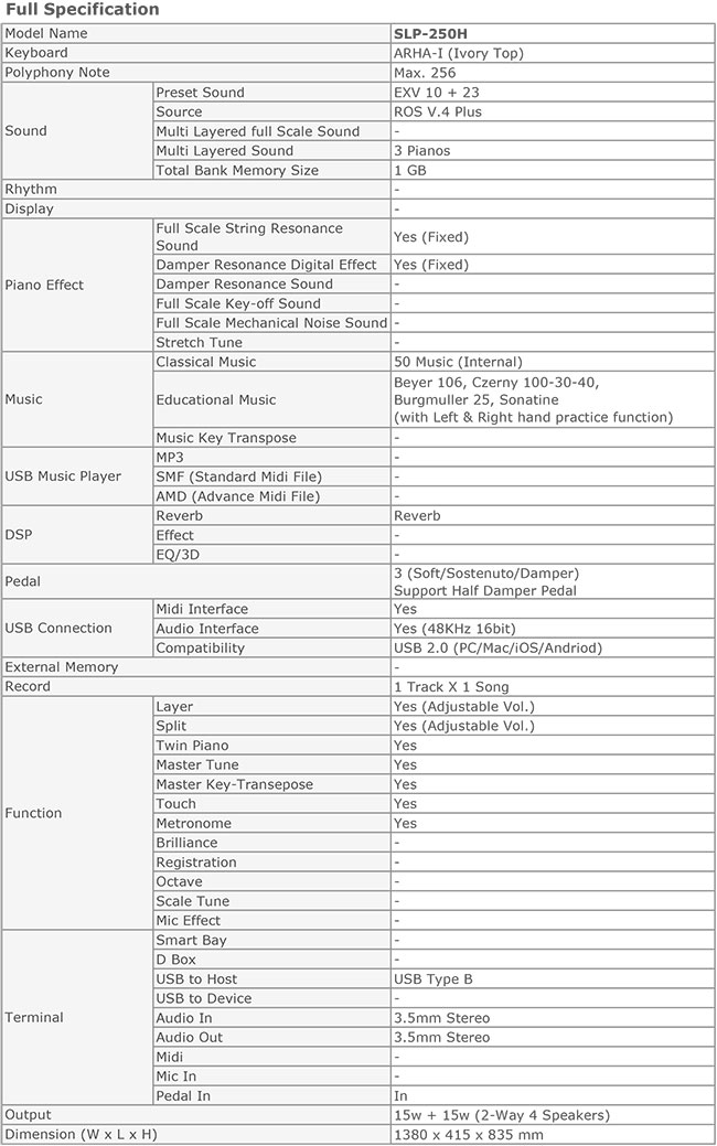 The compact SLP-250H carries a surprisingly powerful sound system while keeping its size minimal, which makes it the perfect piano for home use. 23 selected voices are included, and string and damper resonance is implemented to bring the sound closer to the original. Ivory-topped ARHA-I keyboard allows more precise expression of strong and soft.