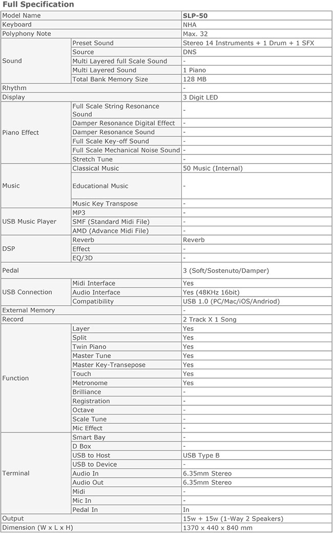 Dynatone's budget offering, the SLP-50 comes with weighted key touch and has great expressive capability considering its price. 14 high-quality voices recreates the sound of instruments just as realistic. Its simple and refined design includes the LED on the middle of the panel for ease of use.